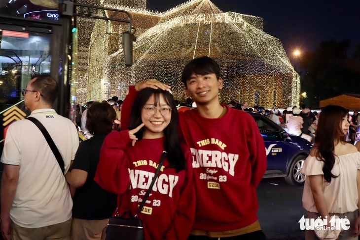Đôi bạn trẻ Tú Anh (TP.HCM) cùng nhau "đu" trend chụp ảnh tại nhà thờ Đức Bà. Tú Anh chia sẻ cảm giác phấn khởi, như được "nạp lại năng lượng" khi được cùng bạn bè tận hưởng bầu không khí Noel, xua tan mệt mỏi sau những ngày học tập bận rộn.