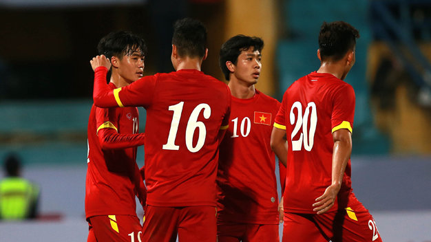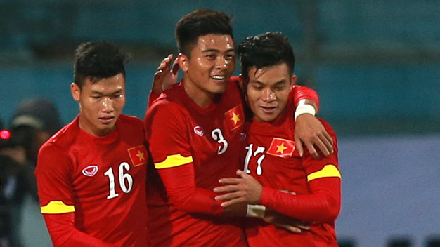| Niềm vui của các cầu thủ U-23 VN sau khi Mạnh Hùng (giữa) gỡ hòa 1-1. Ảnh: Nam Khánh |