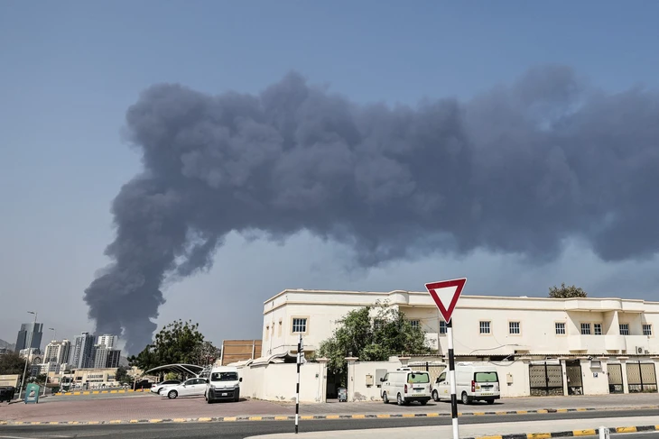 Khói bốc lên từ hướng một cơ sở năng lượng lớn ở Fujairah, UAE vào ngày 14-3. Đây dường như là vụ tấn công mới nhắm vào các cơ sở dầu khí ở vùng Vịnh sau khi Mỹ tấn công đảo Kharg của Iran - Ảnh: AFP