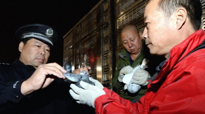 | Nhân viên an ninh đang kiểm tra toàn thân bồ câu - Ảnh: imaginechina.com |