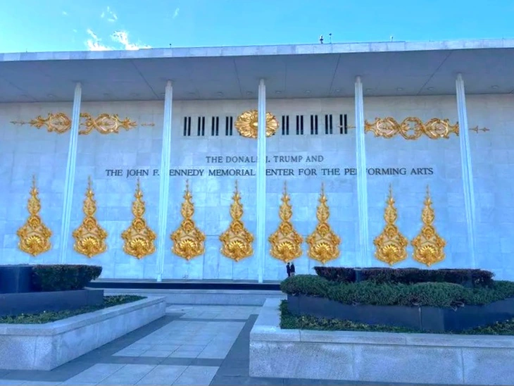 Hình ảnh trong bài đăng cho thấy bức tường bên ngoài Trung tâm Trump - Kennedy được trang trí với các họa tiết chạm khắc nổi mạ vàng theo phong cách tân cổ điển, trong đó có chín họa tiết bên dưới tên của trung tâm và ba họa tiết khác ở phía bên trên.