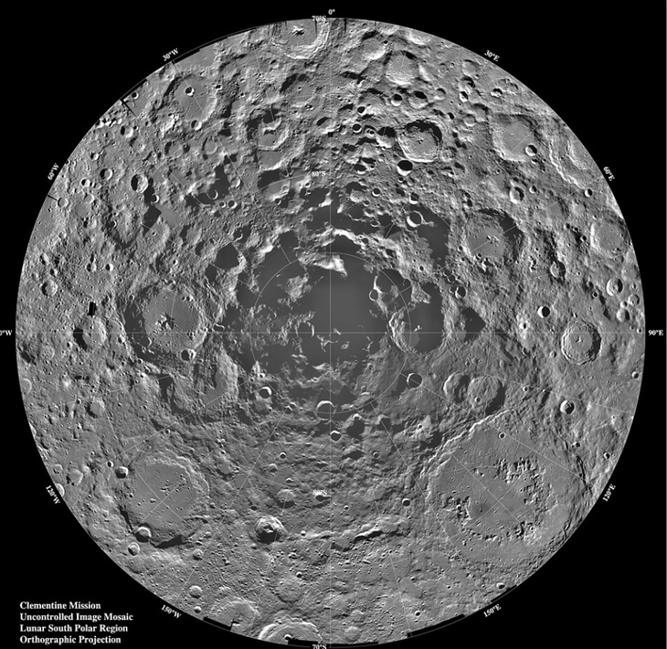 Cực nam Mặt trăng do sứ mệnh Clementine chụp lại - Ảnh: NASA/JPL-Caltech