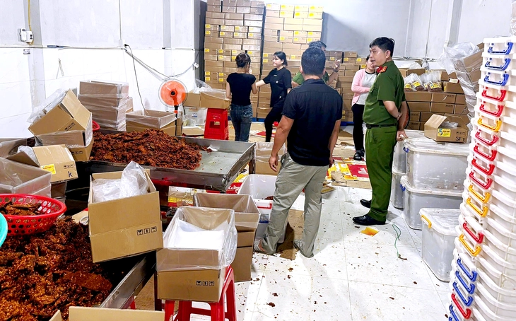 Cảnh sát kiểm tra một cơ sở và niêm phong thực phẩm không hóa đơn chứng từ chứng minh nguồn gốc xuất xứ - Ảnh: Công an TP.HCM
