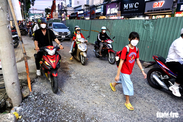 Phần đường để lưu thông hư hỏng, toàn sỏi do thi công dự án thoát nước đường Võ Văn Ngân - Ảnh: ĐỨC PHÚ
