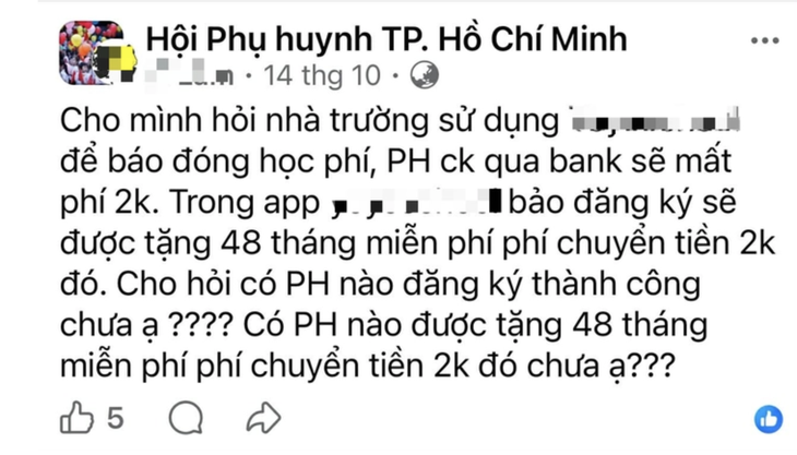 Phụ huynh sai một lần, không bao giờ sai nữa vì giờ ai cũng rành chuyển khoản rồi. Không rành thì đã chạy lên trường đóng, đừng đổ lỗi cho chúng tôi. Và nếu nhà trường muốn tiện lợi, trường phải chịu phí này, chứ không phải phụ huynh".