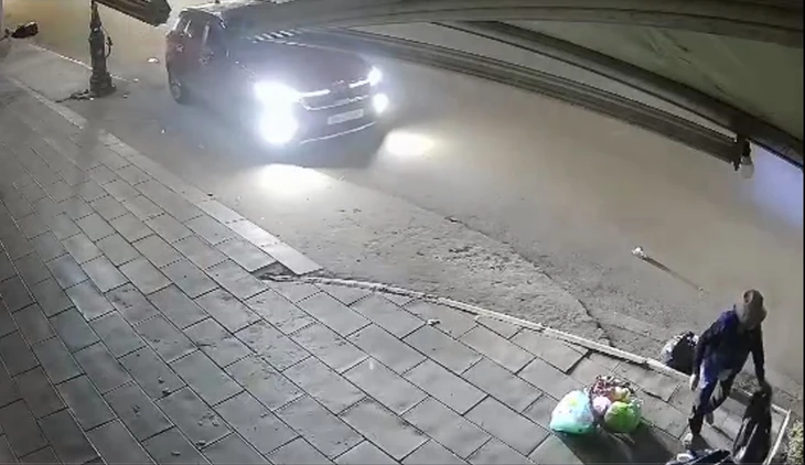 Chiếc xe tiến chậm lại phía người phụ nữ bán hàng rong đang thu dọn đồ trên vỉa hè - Ảnh cắt từ clip