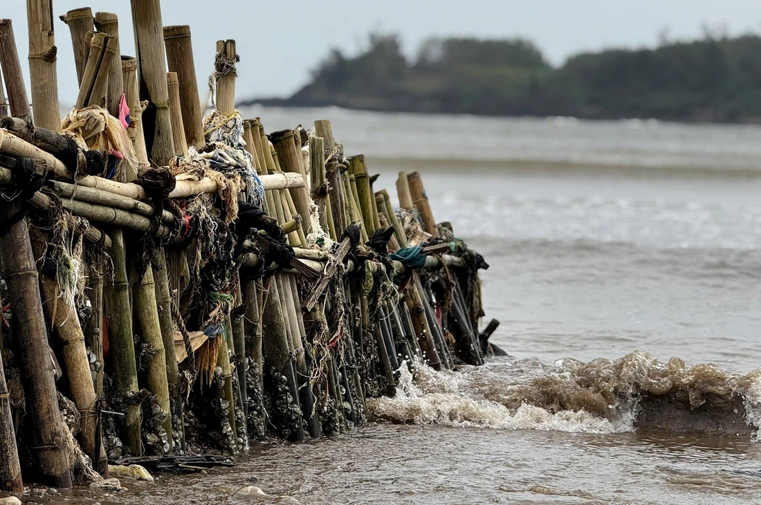 Trước sức ép ngày càng dữ dội của triều cường, người dân nơi đây buộc phải dựng kè tạm để "tự cứu" lấy nhà mình, nhưng hầu hết đều nhanh chóng bị sóng biển phá hủy.