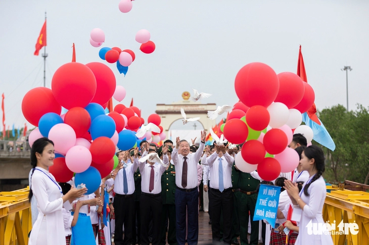 Tổng Bí thư, Chủ tịch nước Tô Lâm cùng cựu cán bộ công an vũ trang giới tuyến và các học sinh thả chim bồ câu trên cầu Hiền Lương lịch sử