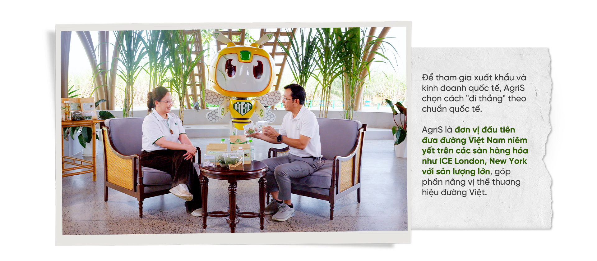 Bà My cho biết để tham gia xuất khẩu và kinh doanh quốc tế, AgriS chọn cách "đi thẳng" theo chuẩn quốc tế. AgriS là đơn vị đầu tiên đưa đường Việt Nam niêm yết trên các sàn hàng hóa như ICE London, New York với sản lượng lớn, góp phần nâng vị thế thương hiệu đường Việt. Đường organic của AgriS đã có mặt ở nhiều quốc gia; riêng tại Mỹ có kênh bán sỉ và bán lẻ: loại bao lớn ở Costco, dạng gói nhỏ ở Walmart.