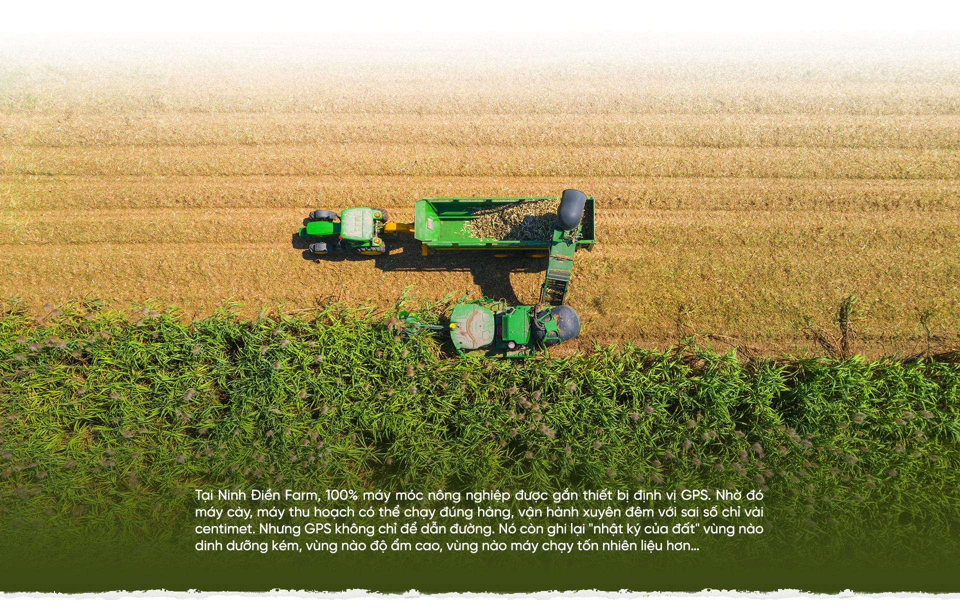 Chẳng hạn, tại Demo Farm (Nông trường khảo nghiệm) Ninh Điền, 100% máy móc nông nghiệp được gắn thiết bị định vị GPS. Nhờ đó máy cày, máy thu hoạch có thể chạy đúng hàng, vận hành xuyên đêm với sai số chỉ vài centimet. Nhưng GPS không chỉ để dẫn đường. Nó còn ghi lại "nhật ký của đất" vùng nào dinh dưỡng kém, vùng nào độ ẩm cao, vùng nào máy chạy tốn nhiên liệu hơn…