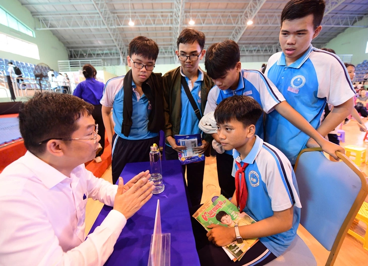 ThS Nguyễn Anh Sơn - chuyên viên Phòng Giáo dục thường xuyên - nghề nghiệp và đại học, Sở Giáo dục và Đào tạo TP.HCM - tư vấn cho các học sinh tại ngày hội Tự tin vào lớp 10 do báo Tuổi Trẻ phối hợp các đơn vị tổ chức ngày 5-4-2026 - Ảnh: QUANG ĐỊNH