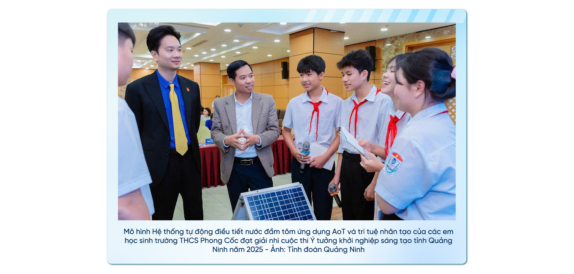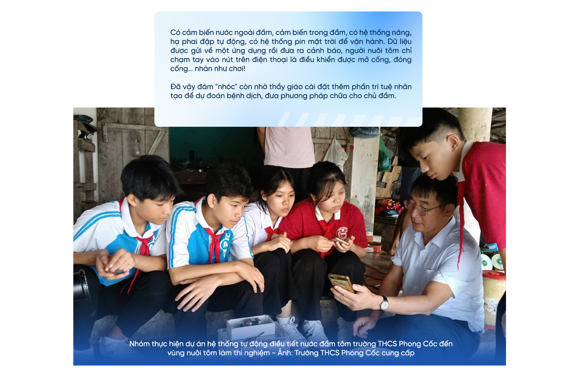 Dự án của đám "nhóc tì" mới học lớp 8, lớp 9 ở Trường Trung học cơ sở Phong Cốc (Quảng Ninh) thu thập những dữ liệu chính xác gửi về điện thoại. Từ mức nước, độ chua, độ mặn, mật độ ô xi, tảo… Nghe thầy giáo hướng dẫn của lũ học trò giải thích đó là công nghệ ứng dụng "vạn vật kết nối mã nguồn mở - IoT".