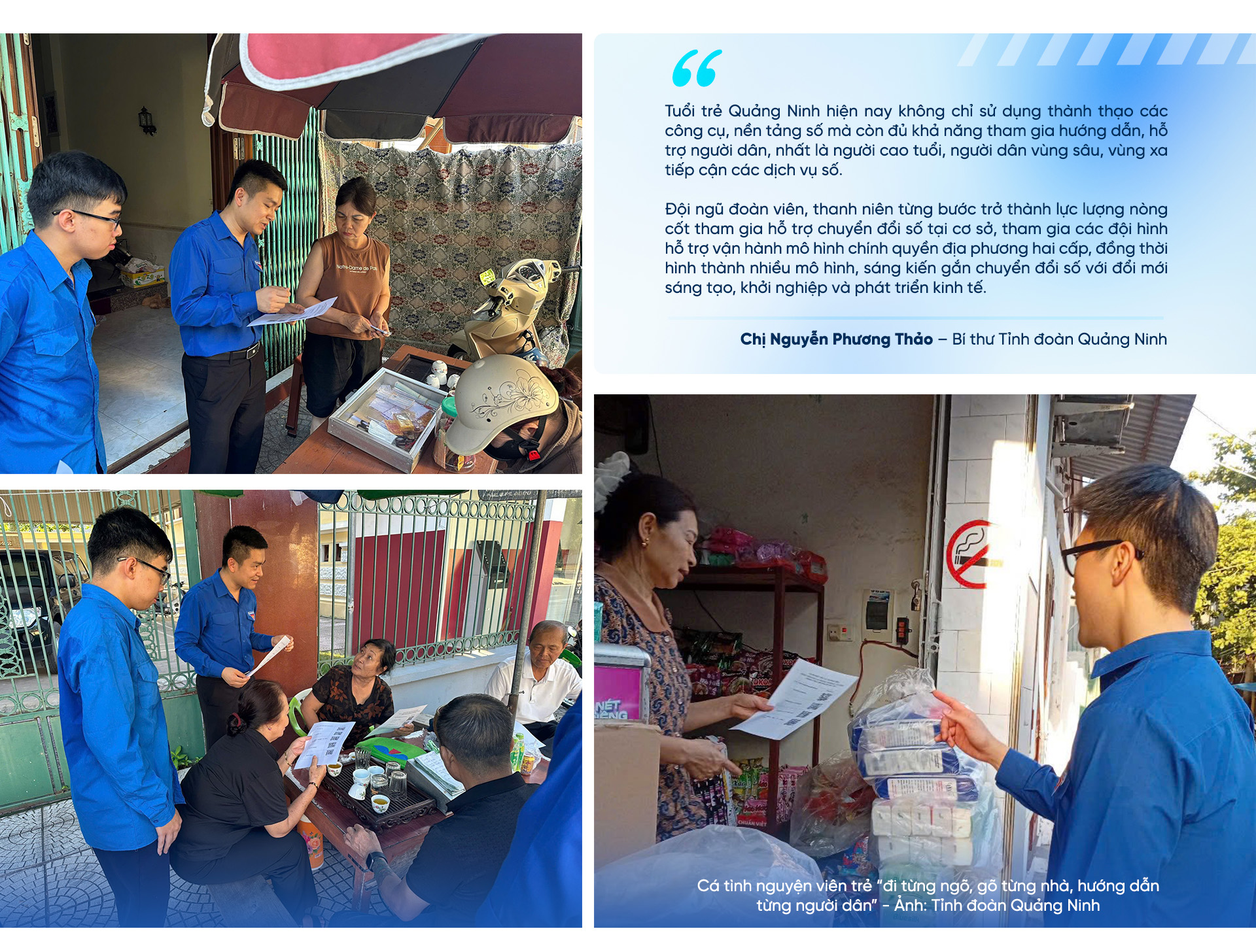 "Tuổi trẻ Quảng Ninh hiện nay không chỉ sử dụng thành thạo các công cụ, nền tảng số mà còn đủ khả năng tham gia hướng dẫn, hỗ trợ người dân, nhất là người cao tuổi, người dân vùng sâu, vùng xa tiếp cận các dịch vụ số. Đội ngũ đoàn viên, thanh niên từng bước trở thành lực lượng nòng cốt tham gia hỗ trợ chuyển đổi số tại cơ sở, tham gia các đội hình hỗ trợ vận hành mô hình chính quyền địa phương hai cấp, đồng thời hình thành nhiều mô hình, sáng kiến gắn chuyển đổi số với đổi mới sáng tạo, khởi nghiệp và phát triển kinh tế" – chị Thảo nói.