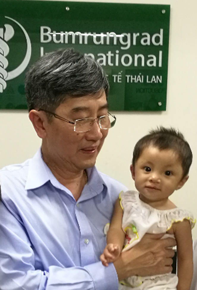 | Bác sĩ PreechaLaohakunakorn đang bế bé Lê Thanh Thảo 10 tháng tuổi hiện đang hạnh phúc và khỏe mạnh |