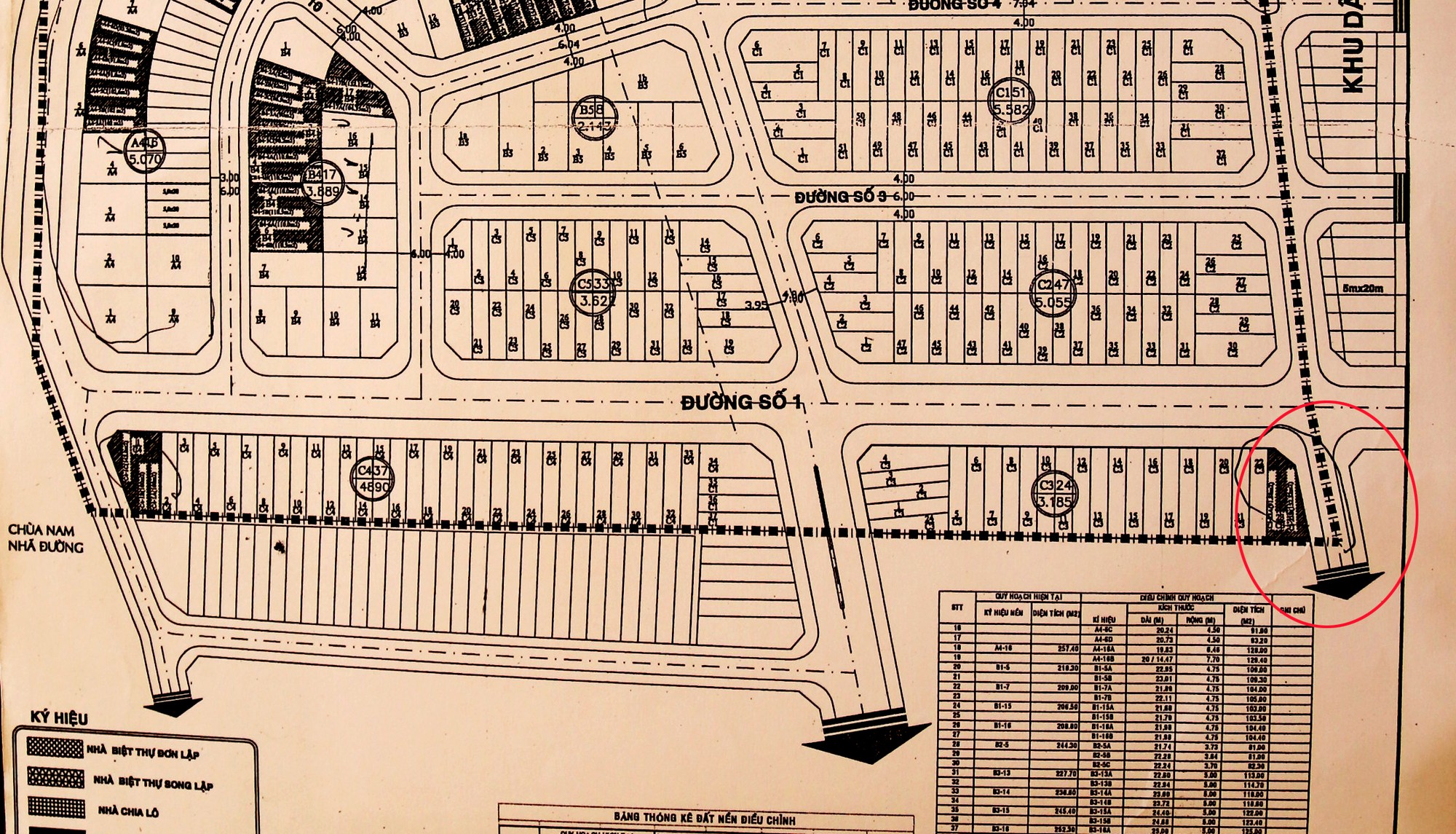 Vị trí khoanh tròn trên bản đồ quy hoạch là giao lộ của đường số 1 và số 6. Phần vỉa hè đường số 6 rộng 3,95m, lòng đường hơn 6m nhưng thực tế vỉa hè và một phần lòng đường đã trở thành khuôn viên biệt thự của tướng Tuấn - Ảnh: CHÍ HẠNH