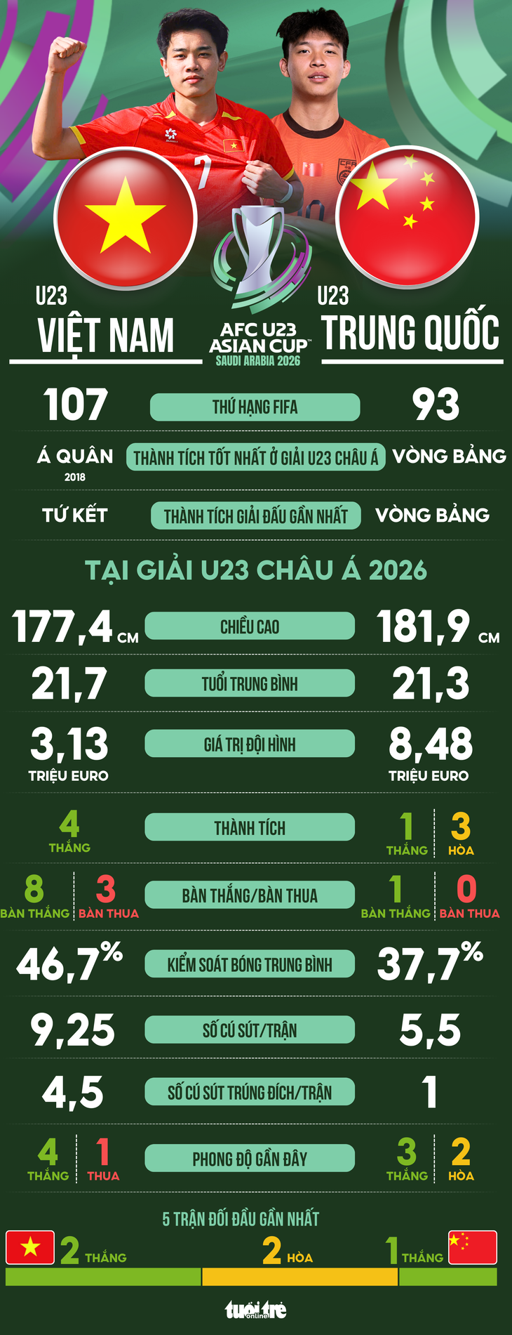 Tương quan sức mạnh giữa U23 Việt Nam và U23 Trung Quốc - Đồ họa: AN BÌNH