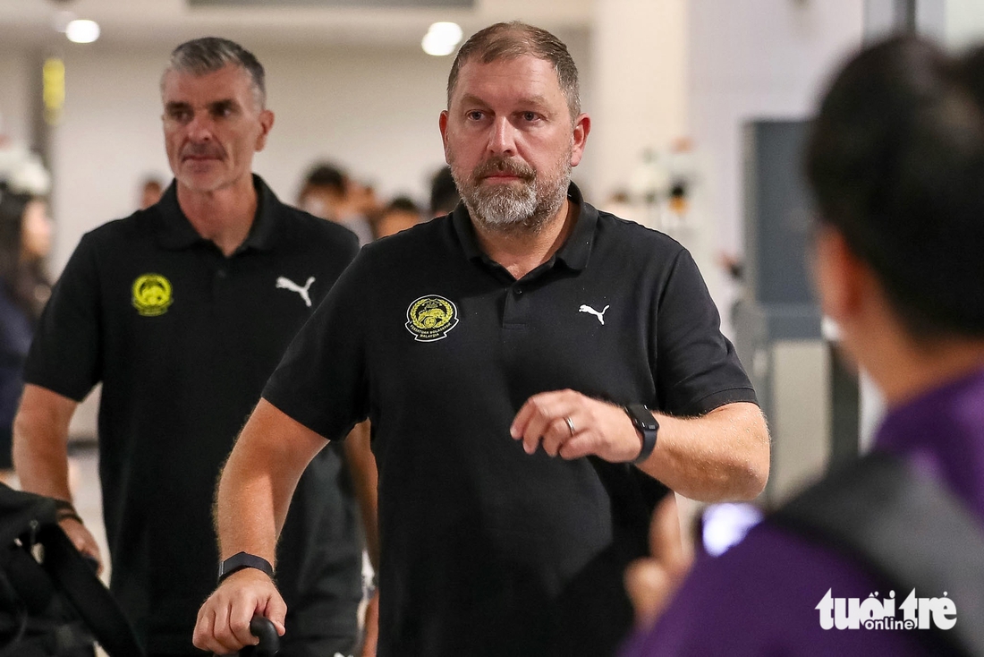 Chuyến bay chở đội tuyển Malaysia hạ cánh xuống sân bay Nội Bài (Hà Nội) lúc 20h15 tối 28-3, tuy nhiên phải đến 21h30 cùng ngày, toàn bộ thành viên đoàn mới làm xong thủ tục và ra khỏi sân bay. Trong hình là HLV trưởng Peter Cklamovski (giữa) - Ảnh: MINH ĐỖ