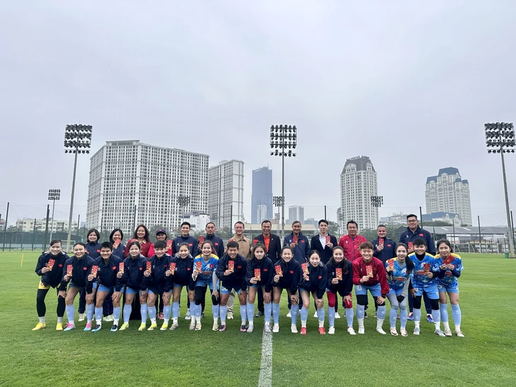 Tuyển nữ Việt Nam hội quân, nhận lì xì từ lãnh đạo VFF - Ảnh: VFF