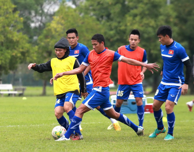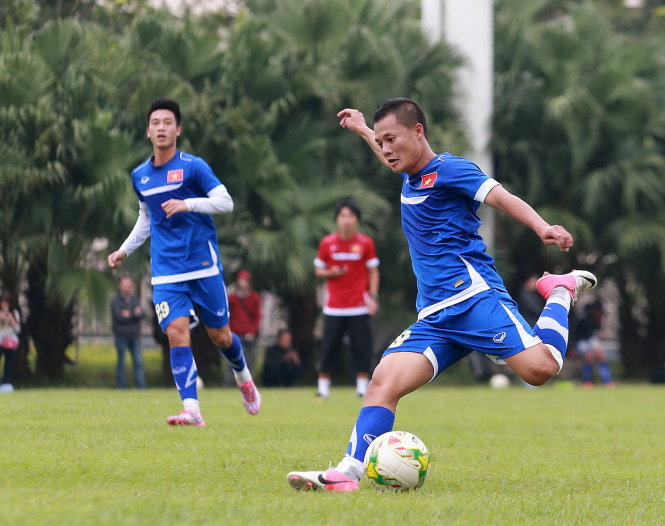 | Công Vinh nỗ lực tập luyện để mong có bàn thắng ở trận lượt đi. Ảnh: Nam Khánh |