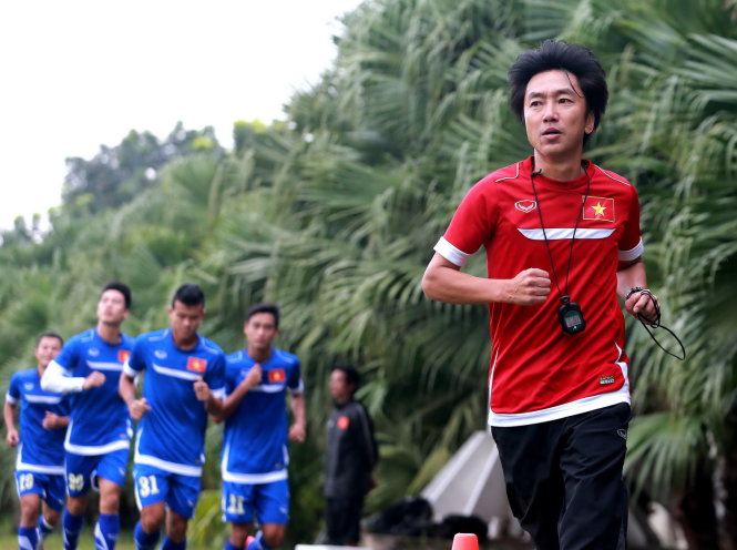 | HLV Miura tham gia chạy với cầu thủ. Ảnh: Nam Khánh |