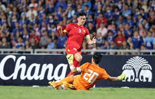 | Công Vinh thất bại trong tình huống đối mặt với thủ môn Thái Lan - Ảnh: N.K. |