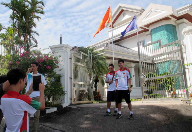 | Cầu thủ U-19 VN tranh thủ chụp hình lưu niệm cho nhau trước Đại sứ quán VN tại Brunei. Ảnh: N.K |