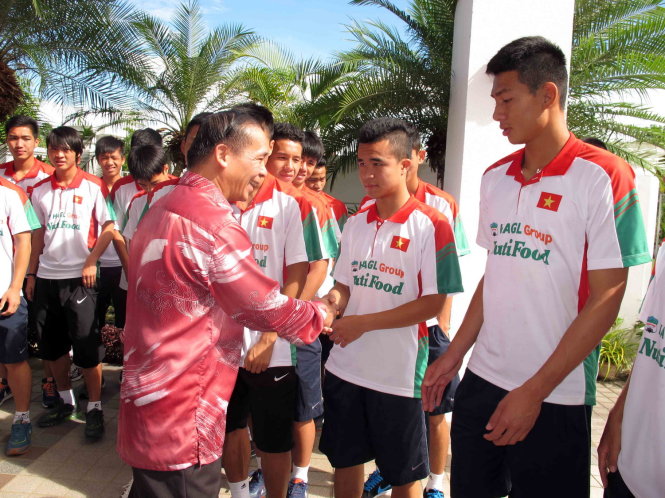 | Đại sứ Nguyễn Trường Giang đón và bắt tay các cầu thủ U-19 VN. Ảnh: N.K |