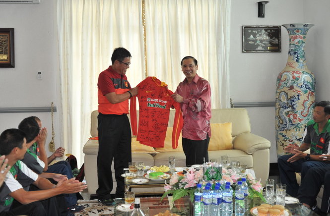| Trưởng đoàn Dương Vũ Lâm tặng áo thi đấu có chữ kí của đội tuyển U-19 VN cho Đại sứ Nguyễn Trường Giang. Ảnh: N.K |