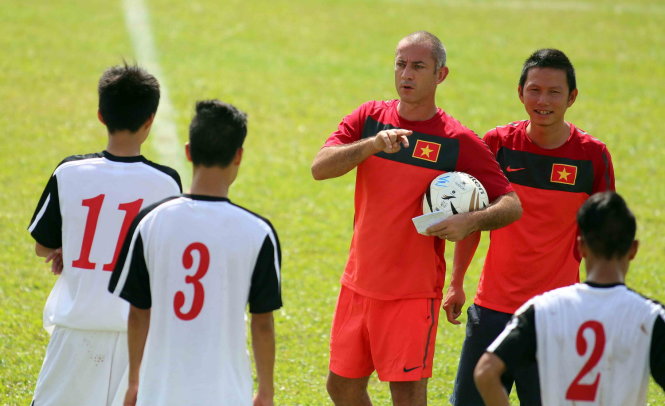 | HLV Guillaume Graechen chỉ đạo các cầu thủ trong buổi tập. Ảnh; N.K |