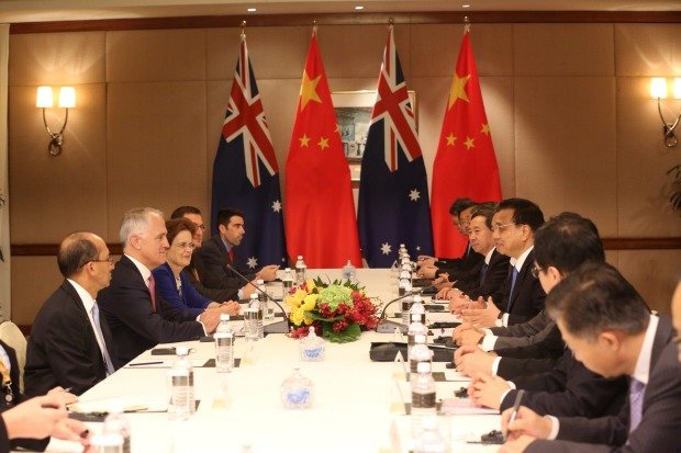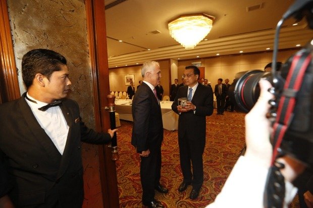 | Thủ tướng Úc Malcolm Turnbull (trái) và thủ tướng Trung Quốc Lý Khắc Cường (phải) sau cuộc họp song phương ở Hội nghị thượng đỉnh Đông Á - Ảnhafr.com |