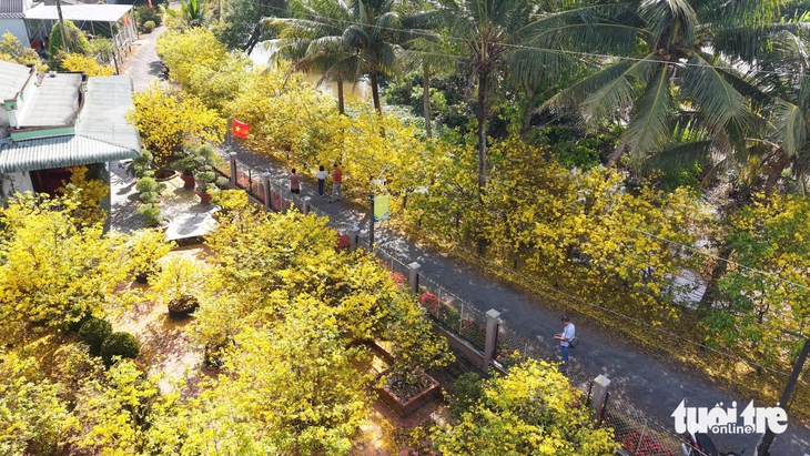Đoạn đường mai vàng khoảng 40m ở xã Hòa Long, tỉnh Đồng Tháp thu hút khách chụp ảnh dịp Tết - Ảnh: ĐẶNG TUYẾT