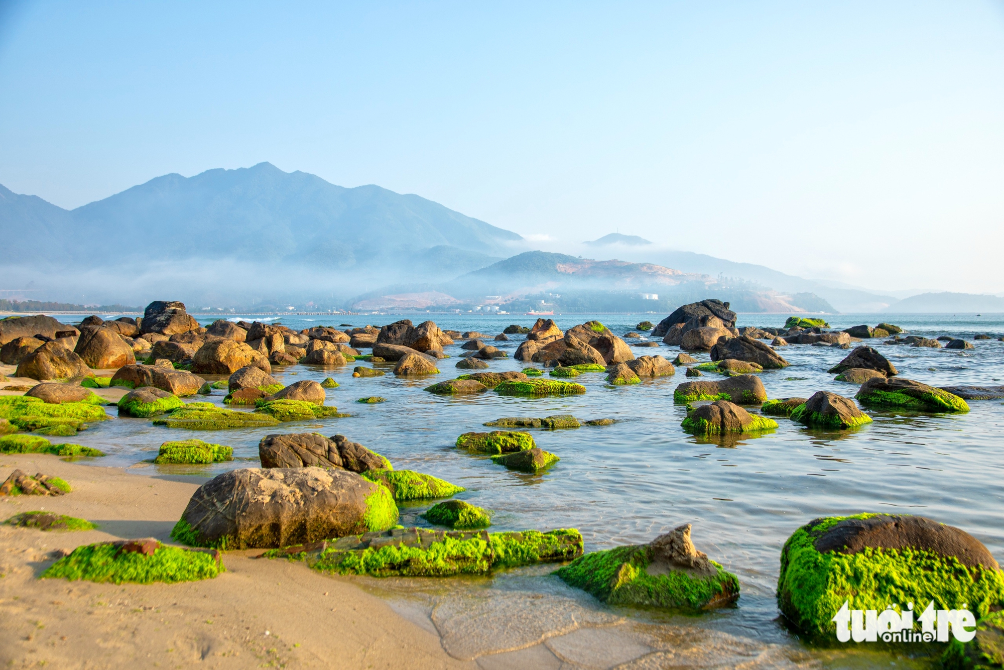 Khi thủy triều rút, từng mảng rêu xanh phủ kín các tảng đá lớn nhỏ, trải dài như tấm thảm mềm mại.