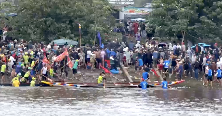 Vận động viên, khán giả dùng mái chèo, gậy lao vào đánh nhau tại cuộc đua ghe truyền thống ở xã Quảng Điền, thành phố Huế hôm 21-12 - Ảnh cắt từ clip