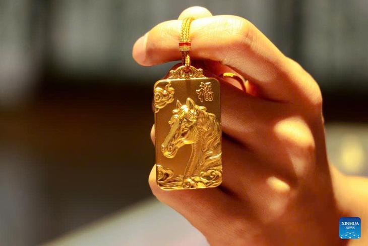 Sản phẩm vàng theo chủ đề năm con ngựa được bày bán tại một cửa hàng ở thành phố Tân Châu, tỉnh Sơn Đông, miền đông Trung Quốc ngày 16-1-2026 - Ảnh: XINHUA