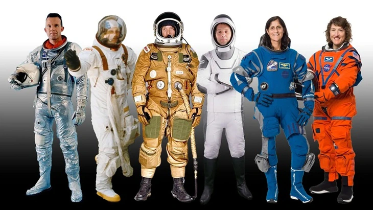 Màu sắc của các bộ đồ phi hành gia trong chương trình Gemini, Apollo, tàu con thoi đời đầu, SpaceX, Boeing và Artemis - Ảnh: NASA/ESA