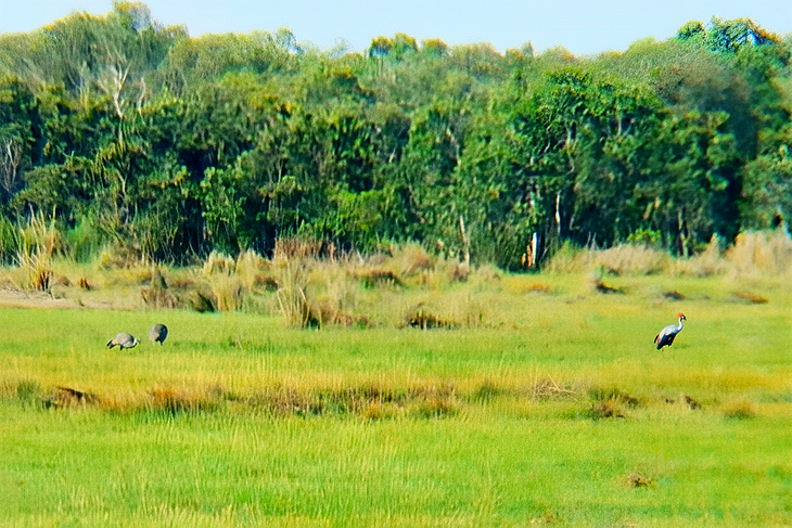 "Hơn 26 con sếu bay qua Khu bảo tồn Phú Mỹ rồi có một gia đình sếu (3 con) đáp xuống kiếm ăn. Sếu này từ Campuchia bay về.