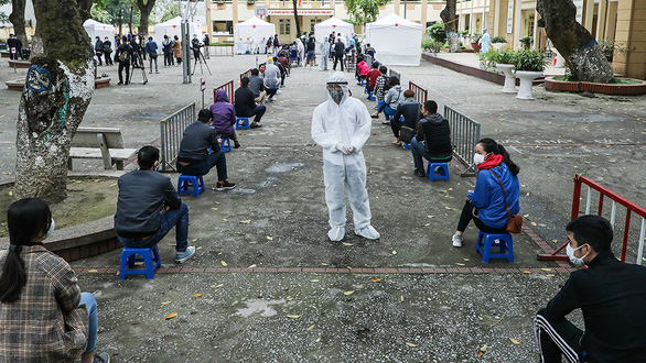 Người dân tại các phường xung quanh Bệnh viện Bạch Mai như Phương Mai, Kim Liên, Đồng Tâm xếp hàng chờ đến lượt xét nghiệm nhanh COVID-19 (ảnh chụp sáng 31-3) - Ảnh: NGUYỄN KHÁNH