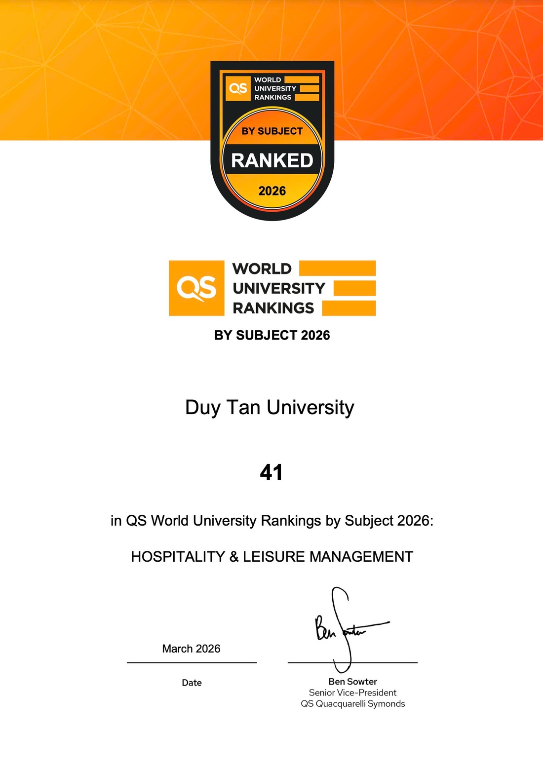 Hiệu quả từ chiến lược này góp phần đưa ngành Du lịch của ĐH Duy Tân vươn cao vào Top 50 thế giới (xếp thứ 41 thế giới theo QS).