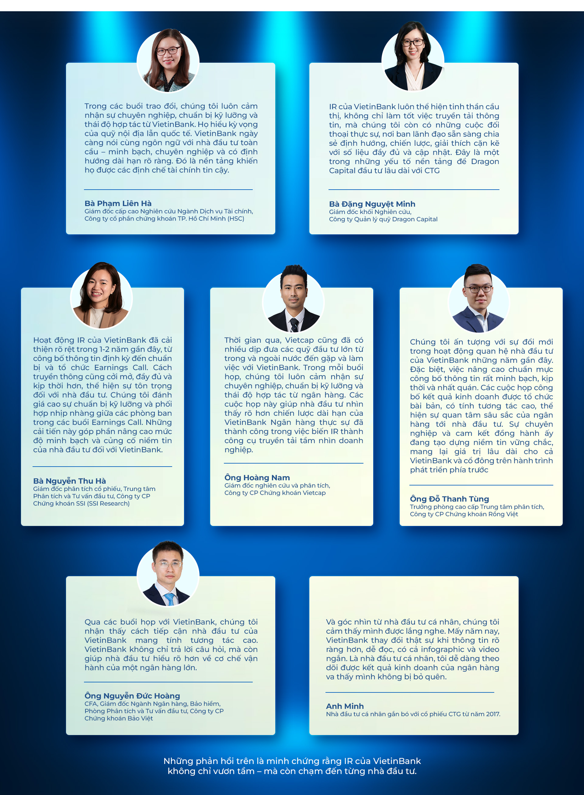 Một hoạt động IR hiệu quả không chỉ phản ánh kết quả hiện tại, mà còn truyền tải câu chuyện về tương lai doanh nghiệp. Với VietinBank, IR giúp nhà đầu tư hiểu rõ năng lực tài chính và củng cố hình ảnh của một định chế tài chính có tầm nhìn chiến lược, quản trị vững vàng và cam kết phát triển bền vững.