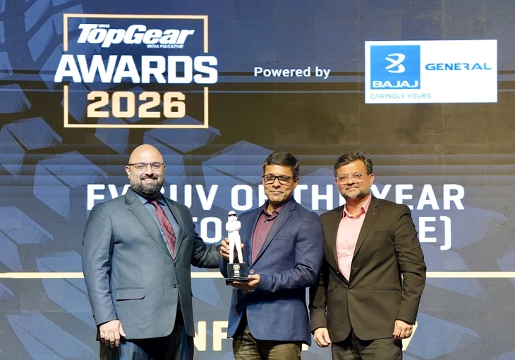 Ông Tapan Ghosh (giữa), CEO VinFast Ấn Độ, nhận giải thưởng từ ban tổ chức BBC TopGear India Awards 2026 - Ảnh: VF