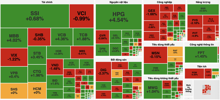 Trong khi đó, HPG tăng 5,72%, trở thành một trong những cổ phiếu đóng góp tích cực nhất cho đà hồi phục của chỉ số.