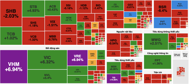 Nhóm bất động sản là điểm sáng nổi bật khi VIC tăng 6,32%, VHM và VRE cùng tăng 6,94%, NVL tăng 5,4%, qua đó trở thành động lực chính kéo VN-Index đi lên.