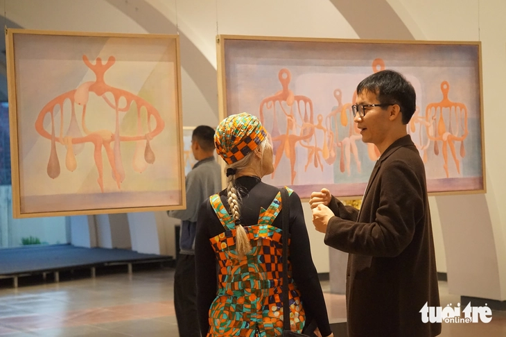 Nghệ sĩ Vũ Hiệp (phải) trao đổi về tác phẩm với nhà sưu tập Suzanne Lecht tại triển lãm Dẫn tượng - Ảnh: T.ĐIỂU