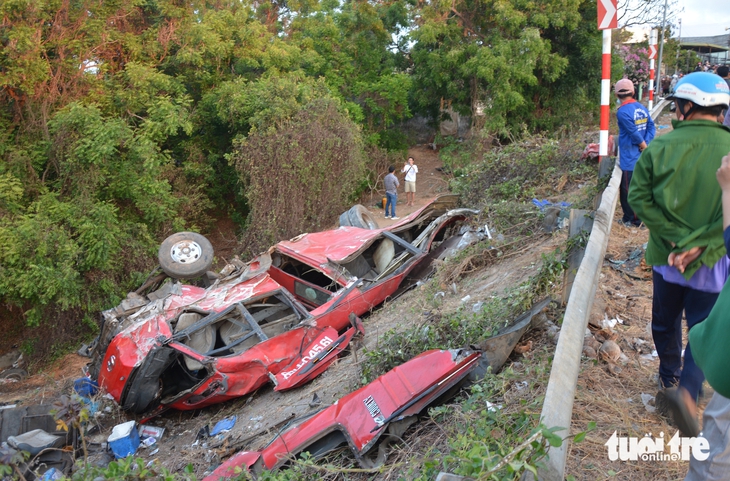 Chiếc xe khách lao xuống vực bên đường ĐT715, xã Hòa Thắng, tỉnh Lâm Đồng khiến 4 người chết tại chỗ và 12 người bị thương - Ảnh: ĐỨC TRONG
