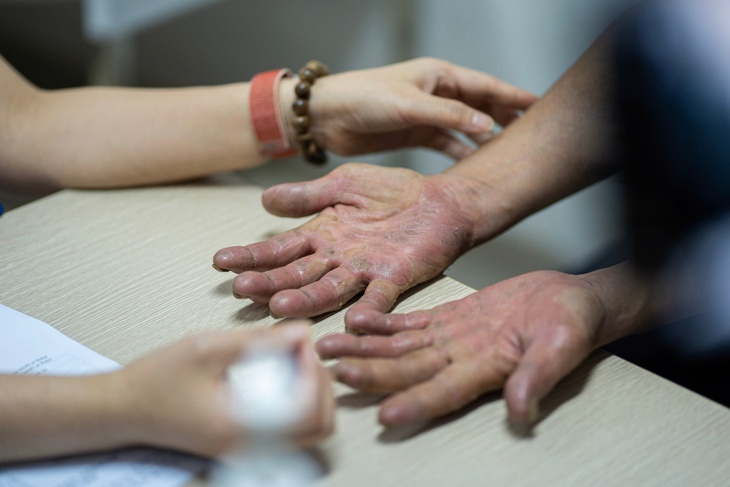 Theo bác sĩ Dung, trong số các bệnh lý, nấm da là tình trạng phổ biến, thường xuất hiện ở vùng chân hoặc ở những người tiếp xúc với vật nuôi như mèo. Bệnh có thể khởi phát chỉ từ vài nốt nhỏ nhưng lan nhanh trong điều kiện nóng ẩm, nhất là khi người bệnh gãi nhiều gây trầy xước da.