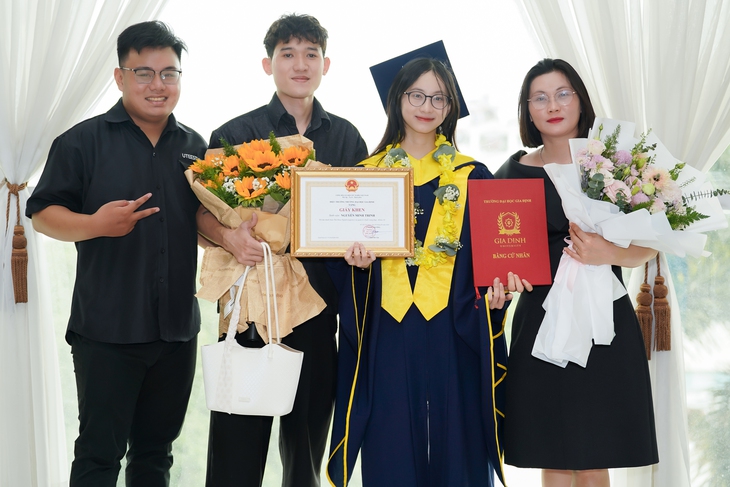 Nguyễn Minh Trinh (thứ hai từ phải sang trái) rạng rỡ khi có bạn bè và người thân đến chia sẻ niềm vui trong ngày tốt nghiệp - Ảnh: GDU