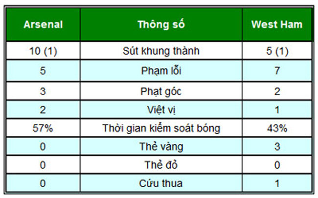 | Những thống kê hiệp 1 trận Arsenal - West Ham |
