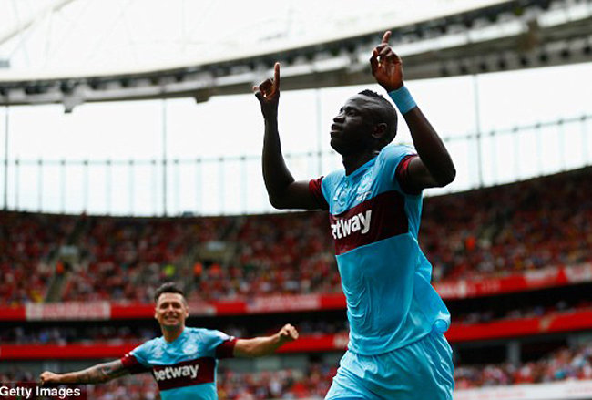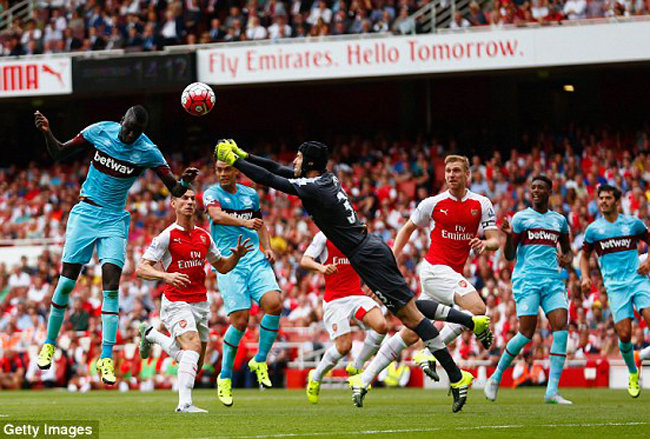 Trong khi đó, dù cầm bóng ít và có số pha dứt điểm chỉ bằng 1/3 so với Arsenal, nhưng West Ham lại hai lần buộc thủ môn nổi tiếng thế giới Petr Cech phải vào lưới nhặt bóng. Phút 43, từ quả đá phạt bên cánh trái, Cheikhou Kouyate thoát khỏi sự đeo bám của hậu vệ Arsenal thoát xuống đánh đầu hạ gục thủ môn Petr Cech, mở tỉ số cho West Ham.