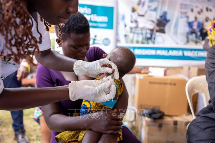 Nhân viên y tế tiêm vắc xin phòng sốt rét cho em nhỏ tại Apac, Uganda - Ảnh: THX/TTXVN