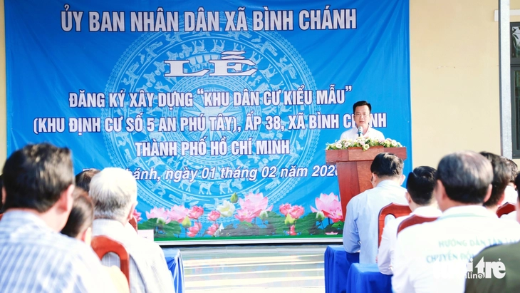 Các đại biểu dự lễ đăng ký xây dựng "Khu dân cư kiểu mẫu" tại khu định cư số 5 An Phú Tây, ấp 38, xã Bình Chánh - Ảnh: NGỌC KHẢI